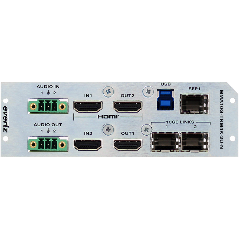 4K modular gateway with IPMX support: 2 HDMI in, 2 HDMI out, USB 2.0/HID host port, 2 analog unbalanced (1 stereo pair) audio in, 2 analog unbalanced (1 stereo pair) audio out, 3 SFP links. Installs in Evertz 7800 series frames.